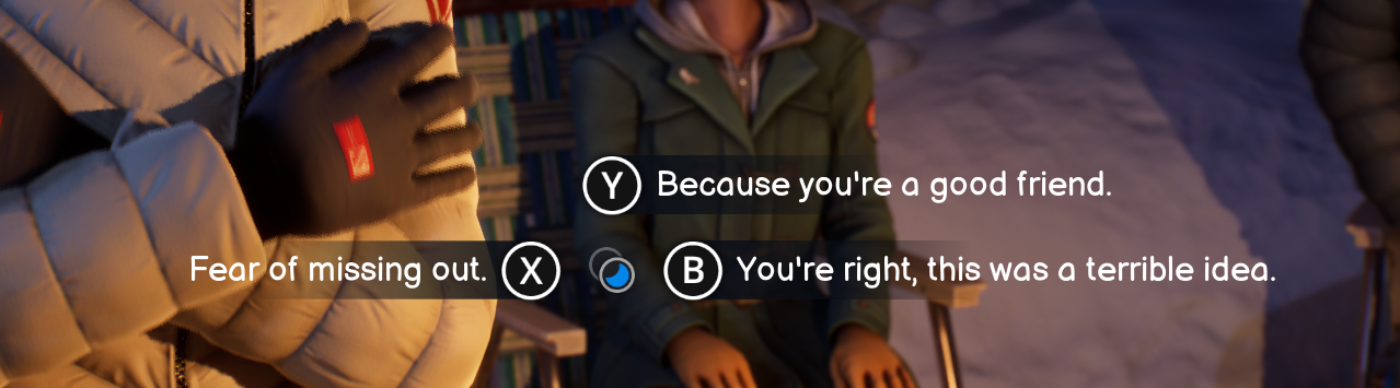 "Leave conversation" always bottom: Maps to the A button (Xbox)/bottom button consistently, establishing input language players can rely on. This allowed players to always hit the same button to return to freerom.